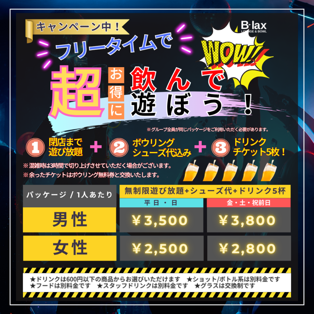 朝まで遊び放題、ボウリングシューズ代込み、ドリンクチケット5枚が付いて、1人2,500円から!