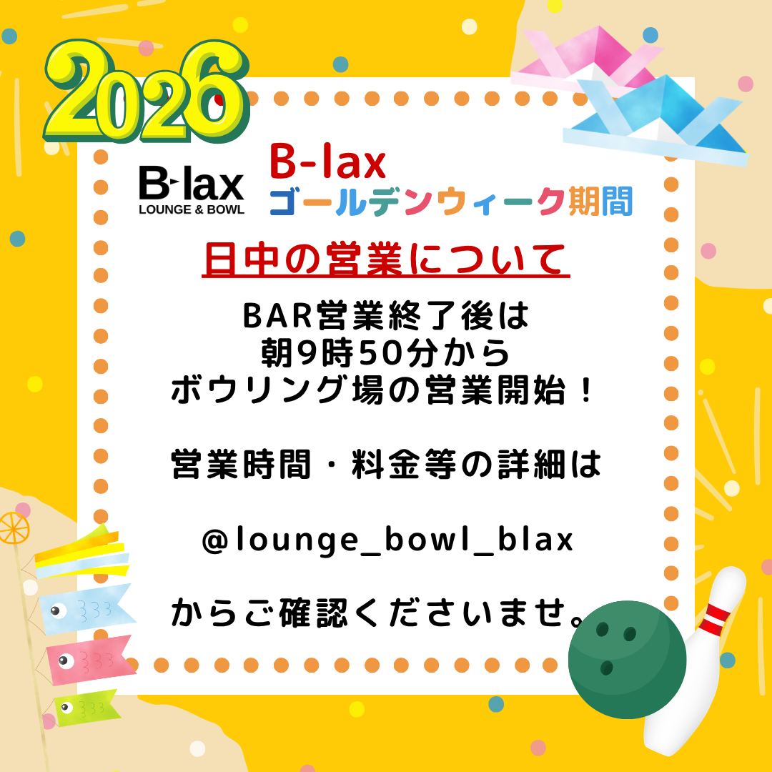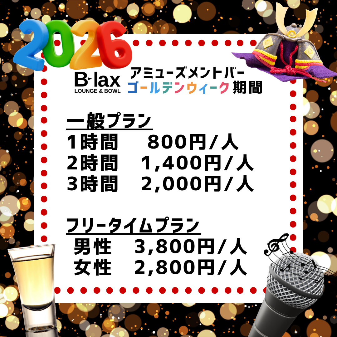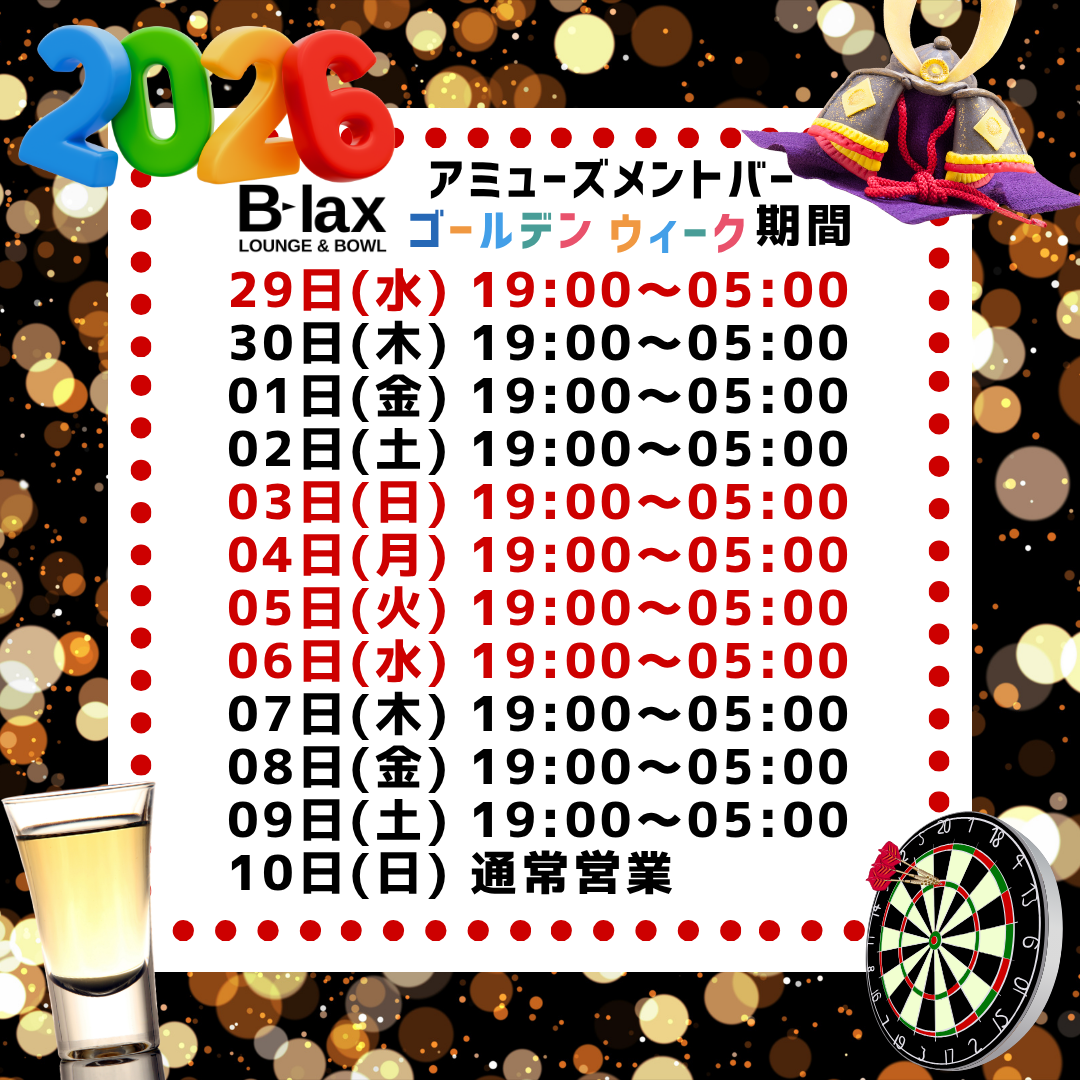 SPECIAL BAR部門 GW(2026)について BAR部門の営業時間と特別料金は以下のページをご確認ください。 ・‥…GW営業時間━━━━☆ 29日(水) 19:00~05:00 30日(木) 19:00~05:00 01日(金) 19:00~05:00 02日(土) 19:00~05:00 03日(日) 19:00~05:00 04日(月) 19:00~05:00 05日(火) 19:00~05:00 06日(水) 19:00~05:00 07日(木) 19:00~05:00 08日(金) 19:00~05:00 09日(土) 19:00~05:00 10日(日) 通常営業(19:00~3:00) ・‥GW料金━━━━☆ 一般プラン 1時間 800円/人 2時間 1,400円/人 3時間 2,000円/人 フリータイムプラン 男性 3,800円/人 女性 2,800円/人 ☆*★*☆*★*☆*★*☆★*☆ LOUNGE&BOWL B-laxは19時からボウリングができるアミューズメントバーに変わります。 ボウリング、ダーツ、ビリヤード、カラオケ、パターゴルフが遊び放題! GWも休まず朝まで営業します! OPEN 19:00 CLOSE 03:00 (金・土・祝前日 ~05:00) 年中無休 / 無料駐輪場OK / 無料駐車場OK / 電子タバコ喫煙OK ☆*★*☆*★*☆*★*☆★*☆